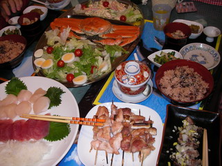 母手作りのお赤飯や茶碗蒸し、ズワイガニ付きマカロニサラダ、お刺身、やきとり、立派なホタテも美味しかったし…