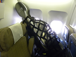 成田空港では、荷物の制限が厳しいし、チェロを座席に置くのに、貨物用の網みたいなのでチェロをしっかり留めたり