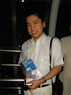 6時半にエレベーターで上りましたので、丁度少しずつ暗くなり、屋形船にも電気が灯り、真っ赤な太陽が沈み、くっきり富士山が見えて、周囲は光り輝いてきて、とても素晴らしい景色に息をのみました。
