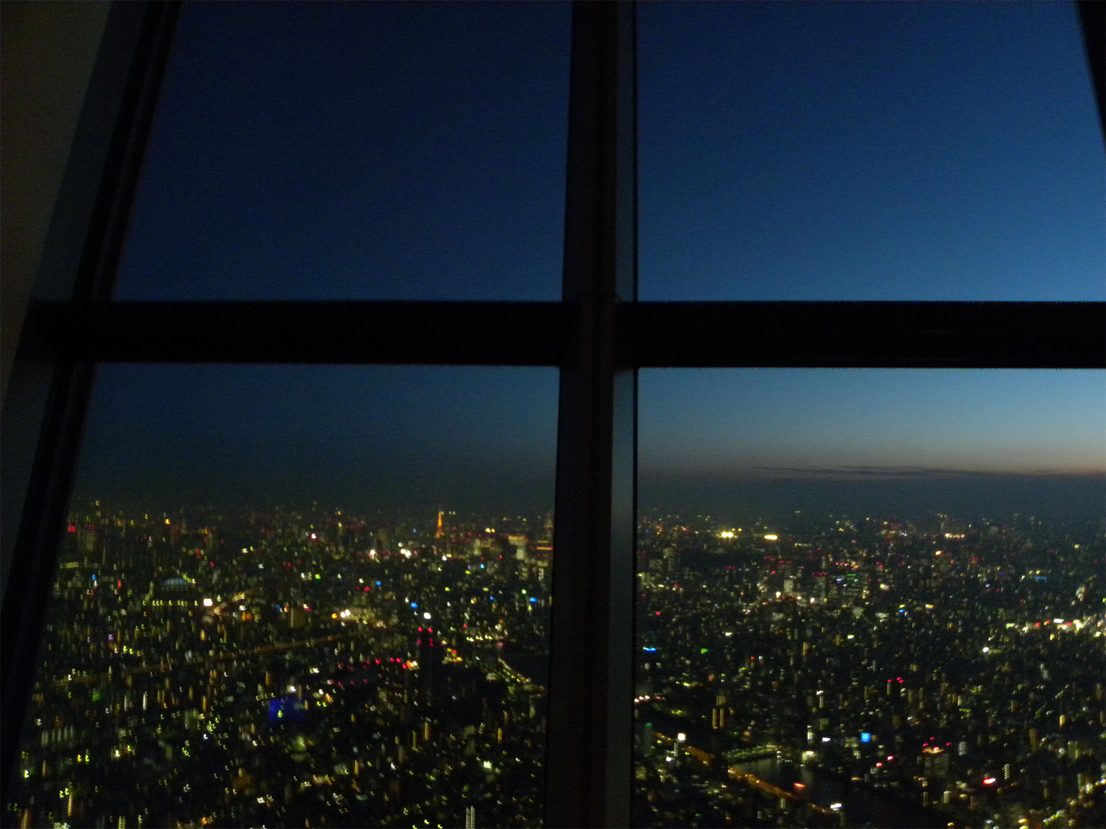 6時半にエレベーターで上りましたので、丁度少しずつ暗くなり、屋形船にも電気が灯り、真っ赤な太陽が沈み、くっきり富士山が見えて、周囲は光り輝いてきて、とても素晴らしい景色に息をのみました。