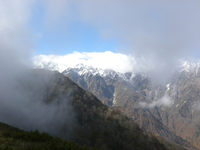 驚くばかりに、あっという間に霧が高い空に舞い上がって、一面雪で覆われた北アルプスとその周辺の紅葉した木々が広がっていました。