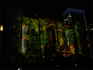 赤レンガの駅舎をスクリーンに見立てて、立体映像が飛び出すように輝きます。