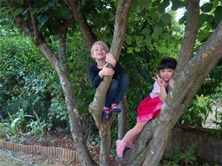 近所の子供たちとも楽しく遊んで、一生懸命片言のフランス語で答えようと頑張っています。