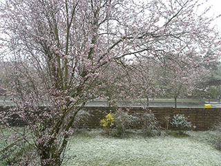 今、庭の写真を撮りましたが、桜の花に雪が積もって重そうです。 ( ;∀;) サムイヨ~