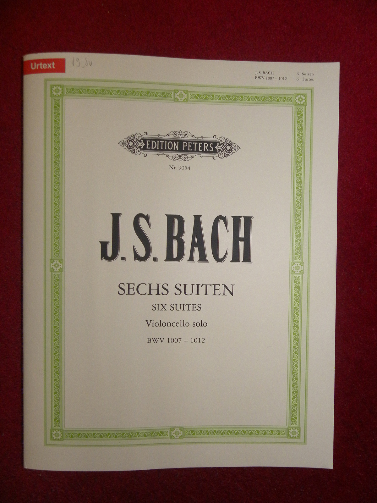 最近バッハの原典版の楽譜がペータース版から出版されたというので、自分が最も良いと思う運指法やフレーズなどを書く為久しぶりに”無伴奏チェロ組曲”の楽譜を購入しました。 (楽譜の左上の赤線に”Urtext”と書いているのが、原典版です。スラーだけで、指番号は1つも書いていません。指番号が書いているバージョンと2つあるので、こちらを購入してみたい方は、お間違えにならないように。)